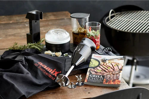De Bamix BBQ box is een staafmixer waarmee elke barbecue avond een succes is. Je klopt, pureert, mixt met de staafmixer die 200 watt aan vermogen heeft. Daarnaast gebruik je deze voor het maken van de lekkerste sauzen en dips zoals guacamole en salsa’s. Je ontvangt de BBQ box met accessoires die je zowel tijdens het barbecueën als gewoon in de keuken gebruikt. Naast het schort ontvang je 2 bekers, een snijmolen, standaard en meer meegeleverd. Wanneer je geen inspiratie om iets lekkers te maken hebt, gebruik je het meegeleverde receptenboekje. De mixerkop zorgt dat de ingrediënten niet spetteren. Na gebruik mogen de losse onderdelen in de vaatwasser.