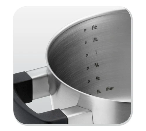 Dankzij de handige literaanduiding meet je vloeistoffen direct in de pannen af.