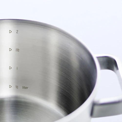 Dankzij de handige literaanduiding meet je vloeistoffen direct in de pannen af.