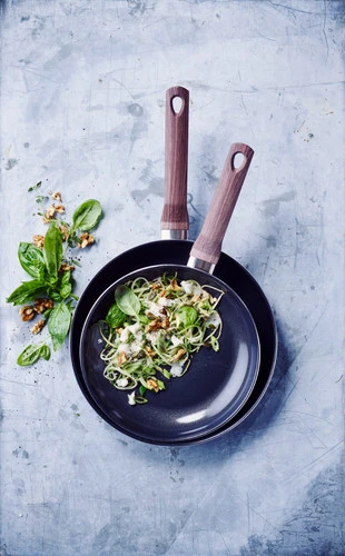 Een kunststof handgreep blijft koel, waardoor je de pan veilig naar de eettafel verplaatst.