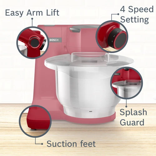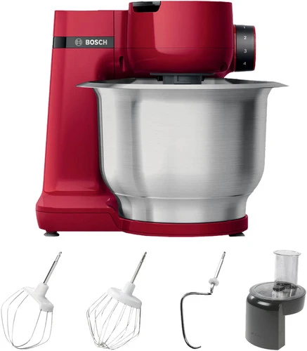 Je gebruikt de Bosch MUMS2ER01 Rood niet alleen als bakhulp, maar ook als kookhulp. Dankzij het meegeleverde foodprocessor opzetstuk snijd en rasp je namelijk ook ingrediënten. In de mengkom van 3,8 liter maak je taartbeslag voor één springvorm. De 3D Planetary Mixing techniek zorgt dat de klopper 3 richtingen op beweegt. Hierdoor mengt de keukenmachine het beslag goed en luchtig. De antislipvoetjes zorgen dat de keukenmixer tijdens het kneden van de ingrediënten netjes op zijn plek blijft staan. De losse accessoires zijn vaatwasserbestendig en reinig je na gebruik dus makkelijk.