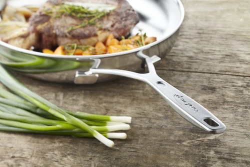 De Demeyere Industry 5 Koekenpan 32 cm is ideaal voor het bakken van 4 of meer grote stukken vlees. De bodem van de pan is opgebouwd uit 5 lagen die doorlopen tot de rand, zodat de warmteverdeling door de hele pan optimaal is. De pan heeft geen antiaanbaklaag, hierdoor is ‘ie ideaal voor het aanbakken van een heerlijk malse biefstuk. De handvatten zijn gelast, zodat vuil geen kans krijgt zich te nestelen tussen de handvatten en de pan. De koekenpan is afgewerkt met een oppervlaktebehandeling, zodat je de pan gemakkelijk schoonmaakt en het rvs zilverwit blijft. Je reinigt de pan gewoon in de vaatwasmachine. Wil je extra lang van de pan genieten? Was ‘m dan even met de hand af.
