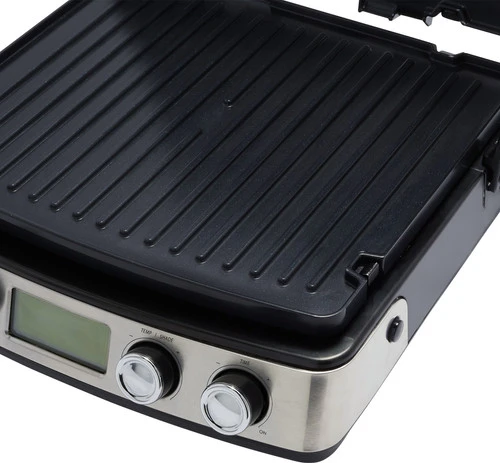Je stelt de contactgrill tot 260 graden Celsius in, zodat je vlees snel braadt voor een krokant randje.