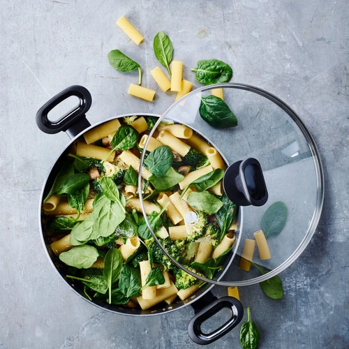 In deze pannenset zit ook een hapjespan, zodat je roerbak- en stoofschotels maakt.