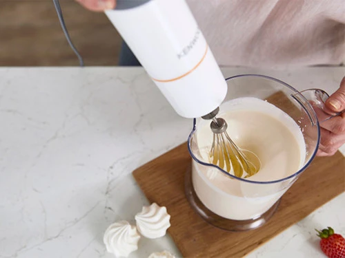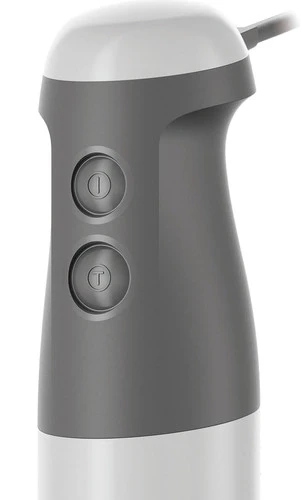 Je gebruikt deze staafmixer kort voor harde ingrediënten en langer achter elkaar voor zachte ingrediënten.