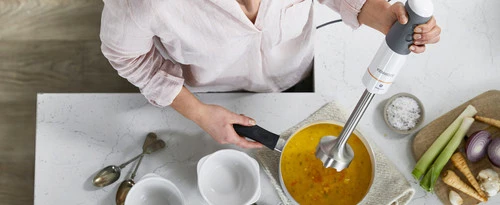 De lange staafmixervoet is ideaal voor in grote pannen soep.