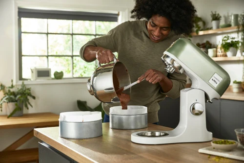 De mengkom heeft een inhoud van 5 liter, zodat je in één keer beslag maakt voor 2 cakes.