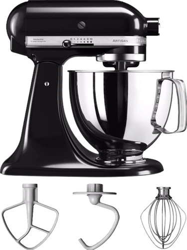 De KitchenAid Artisan Mixer 5KSM125 Onyx Zwart heeft een directe aandrijving van de motor, zodat er minder vermogen nodig is om veel kracht te leveren. Fijn, want dit maakt jouw keukenmixer energiezuiniger. De motor is krachtig genoeg om ook af en toe zwaar deeg te kneden. Zo maak je niet alleen taarten en cakes, maar zet je ook jouw eigen pizza of brood op tafel. De mengkom heeft een handgreep, zodat je ‘m gemakkelijk pakt en op de mixer bevestigt. Je maakt in één keer beslag voor 1,5 taart in de mengkom van 4,8 liter. Bij deze keukenmixer zit een deeghaak voor het kneden van deeg, een menghaak voor het mengen van zware mengsels en een draadgarde voor het luchtig stijfslaan van slagroom.