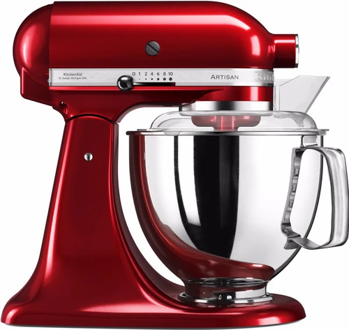 Met de KitchenAid Artisan Mixer 5KSM175PS maak jij met weinig inspanning deeg en beslag. Deze krachtige keukenmixer heeft een vermogen van 300 watt, maar de motor bevindt zich in de kop. Hierdoor kan hij met gemak zwaar brooddeeg aan, want er gaat geen energie verloren tussen de menghaak en de motor. De kop van de KitchenAid is kantelbaar, hierdoor verwissel je de deeghaken eenvoudig. Doordat er 2 mengkommen worden meegeleverd hoef je tussendoor niet af te wassen en het antispatdeksel voorkomt een aanrecht vol beslagspetters. Wil je de mogelijkheden van je KitchenAid Artisan verder uitbreiden? Er is een groot assortiment opzetstukken verkrijgbaar. Deze bevestig je op het aansluitpunt aan de voorzijde.