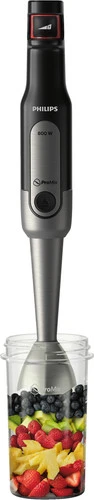 Je gebruikt deze staafmixer kort voor harde ingrediënten en langer achter elkaar voor zachte ingrediënten.
