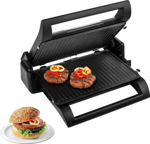 Je klapt de contactgrill helemaal open, zodat je hem ook als tafelgrill gebruikt.