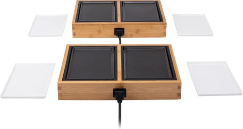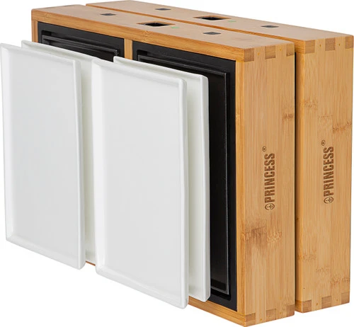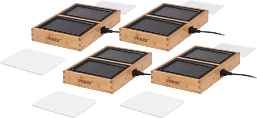 De Princess Dinner4All Pure is geschikt voor 8 personen. Je verbindt 2 losse platen gemakkelijk aan elkaar. Handig, want zo zijn er maar twee stopcontacten nodig en geen 4. Doordat je op 4 losse platen bakt, is het mogelijk om deze tussen verschillende gerechten te verdelen. Bijvoorbeeld voor vlees, vis, groenten en pannenkoeken. De grill bestaat uit 2 verschillende soorten bakplaten, een witte en een zwarte. De witte bakplaten zijn krasbestendig met een keramische laag en gebruik je ideaal als bord. De zwarte bakplaten hebben een antiaanbaklaag, hierdoor blijven je ingrediënten niet plakken. Je plaatst de uitneembare platen simpelweg in de vaatwasser en berg je daarna gemakkelijk op in het houten frame.