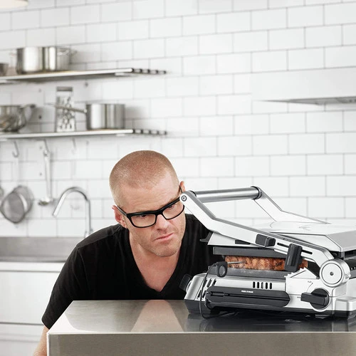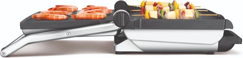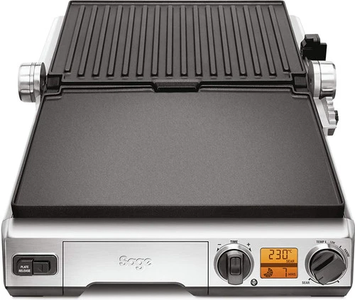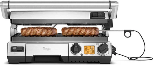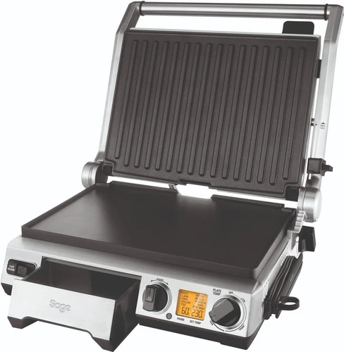 Met de Sage the Smart Grill Pro gril je snel vlees, dankzij het vermogen van 2.400 watt. Hierdoor is de contactgrill snel opgewarmd en heb je in een mum van tijd malse stukken biefstuk. Je kiest uit verschillende automatisch bakprogramma¿s voor rund, varken, kip en vis. Handig, want zo denk je niet meer na over de juiste instellingen. Je stelt ook handmatig de temperatuur in. Zo bak je jouw vlees doorbakken of medium. Met de meegeleverde vleesthermometer lees je direct af of je vlees op temperatuur is. Je klapt de grill ook uit tot een kleine tafelgrill. De losse platen reinig je na gebruik in de vaatwasser.