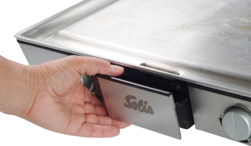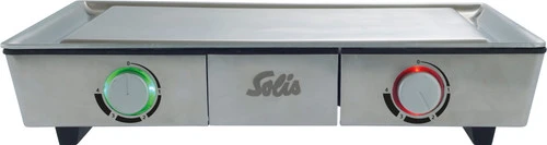 Met de Solis 795 Teppanyaki@Home bereid je heerlijke oosterse gerechten, maar hij is ook geschikt voor plancha grillen. De tafelgrill heeft een massieve bakplaat met een oppervlak van edelstaal. Hierdoor wordt de hitte gelijkmatig verspreid. De royale plaat is voorzien van een geul, vet wordt zo afgevoerd naar een geïntegreerde opvangbak. Door de 2 individuele thermostaten regel je de temperatuur van de bakzones afzonderlijk van elkaar; niet ieder ingrediënt heeft immers dezelfde temperatuur nodig. Overgiet een stuk vis met wijn en dek deze af met de stolp om een stuk vis te stomen en draai de ingrediënten vervolgens gemakkelijk om met de 2 meegeleverde spatels. De Solis grill staat stevig op antislipvoetjes en de kabel berg je na gebruik netjes op met de kabelwikkelaar.