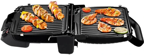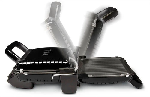 Je klapt de contactgrill helemaal open, zodat je ‘m ook als tafelgrill gebruikt.
