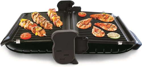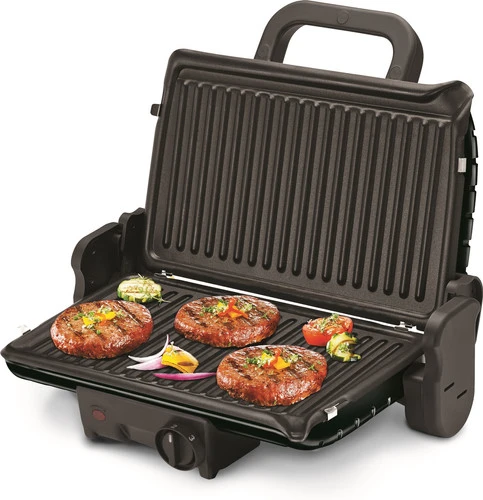 Je klapt de contactgrill helemaal open, zodat je hem ook als tafelgrill gebruikt.
