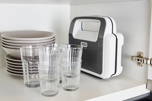 Met de Tefal Snack XL Sandwich Maker SW7011 bereid je rijkelijk belegde sandwiches en tosti’s, dankzij de extra grote platen. De platen zijn groter en dieper dan standaard platen. Hierdoor beleg je je brood met al je favoriete ingrediënten en gebruik je elk soort brood. De contactgrill beschikt over een vergrendeling. Door de grill te vergrendelen druk je het brood goed tegen elkaar en warmt het egaal op. Je wisselt de platen gemakkelijk om met de meegeleverde wafelplaten. Zo maak je ook heerlijke verse wafels. De uitneembare platen reinig je eenvoudig in de vaatwasser. Je bergt de contactgrill vervolgens verticaal op, waardoor je ruimte bespaart in je kast.