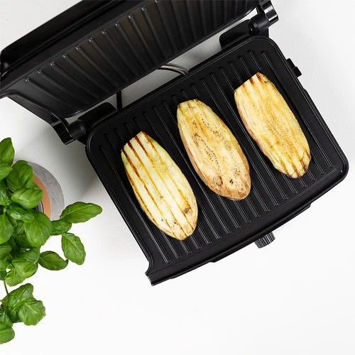 Je klapt de contactgrill helemaal open, zodat je ‘m ook als tafelgrill gebruikt.